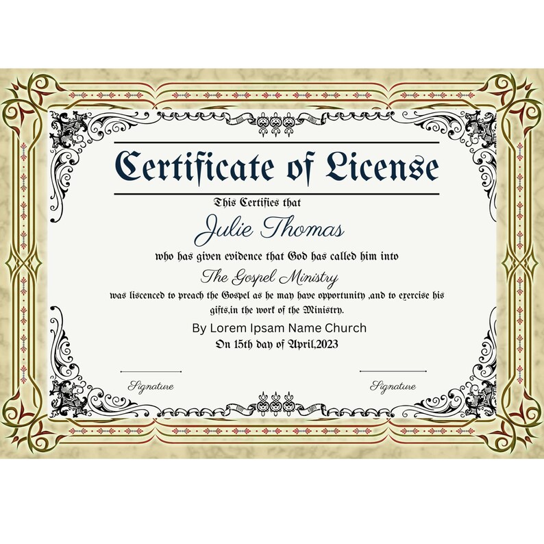 Minister License Certificate Template Etsy