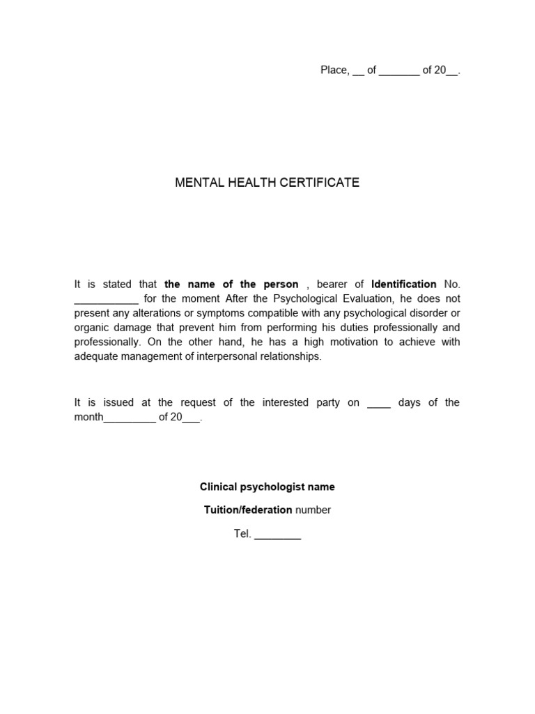 Mental Health Certificate Format PDF