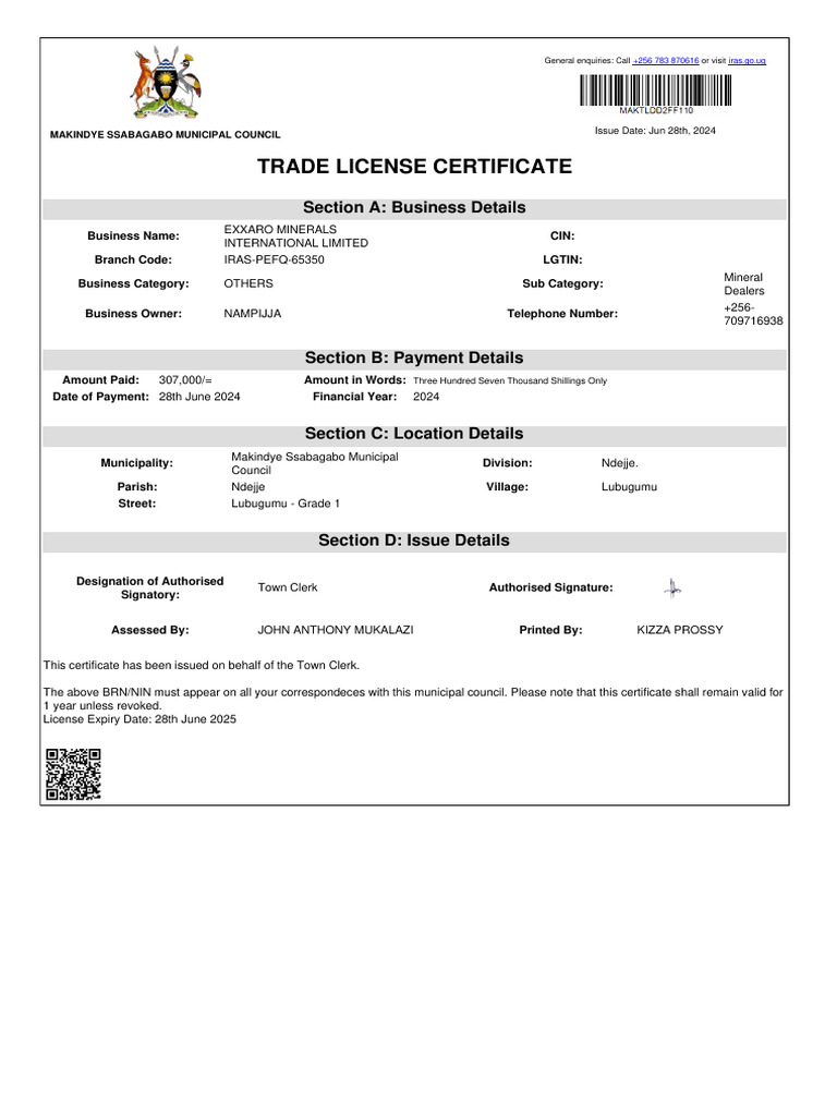 Certificate trade license certificate Union Union trade license