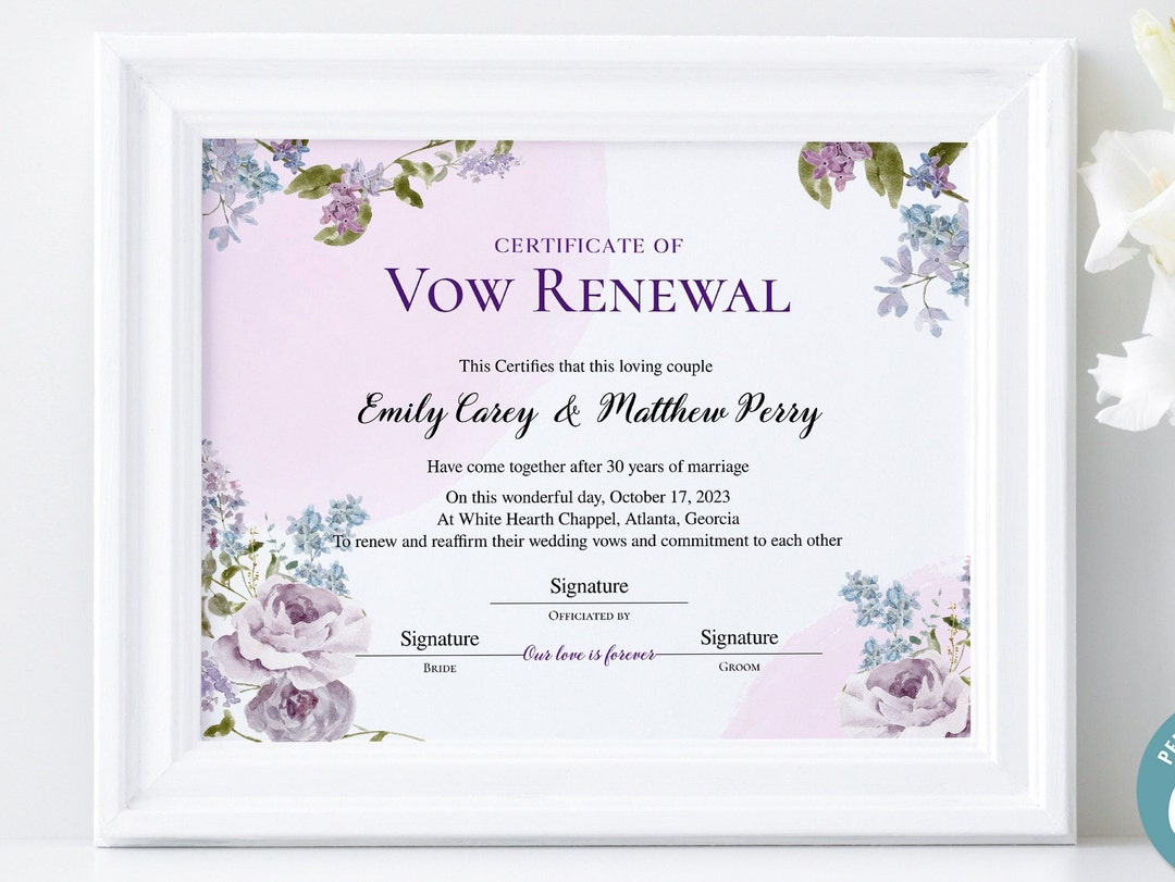 Free Printable Purple Floral Certificate of Vow Renewal Renewing your