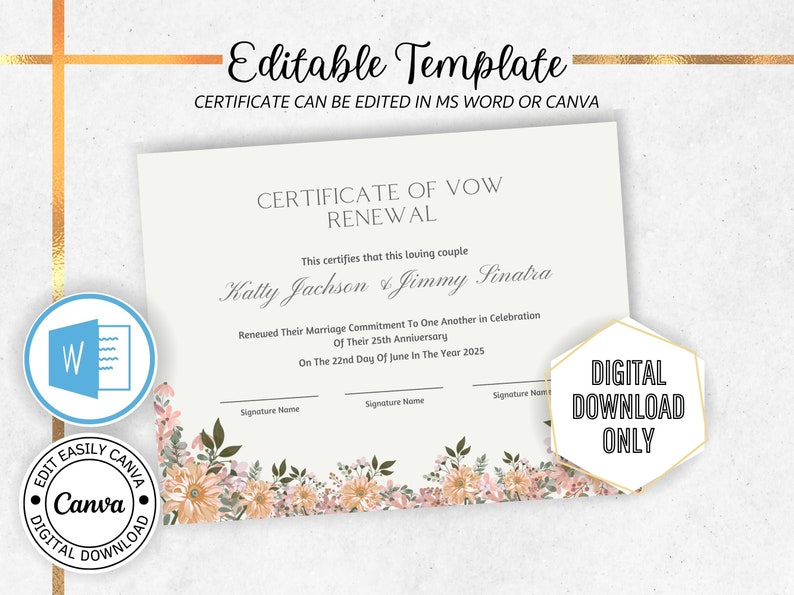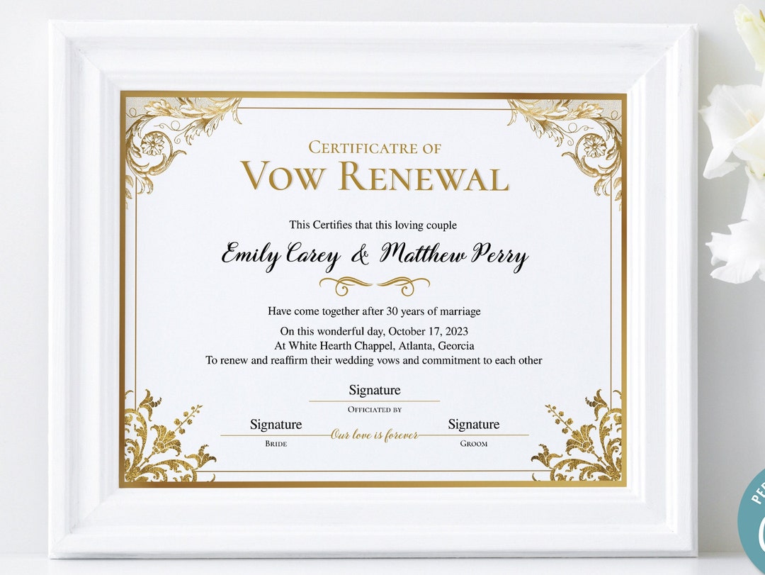 Editable Certificate of Vow Renewal Template Marriage Etsy