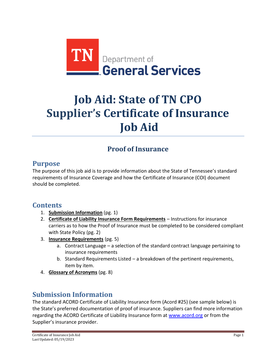 Tennessee Certificate of Insurance Job Aid Fill Out Sign Online and