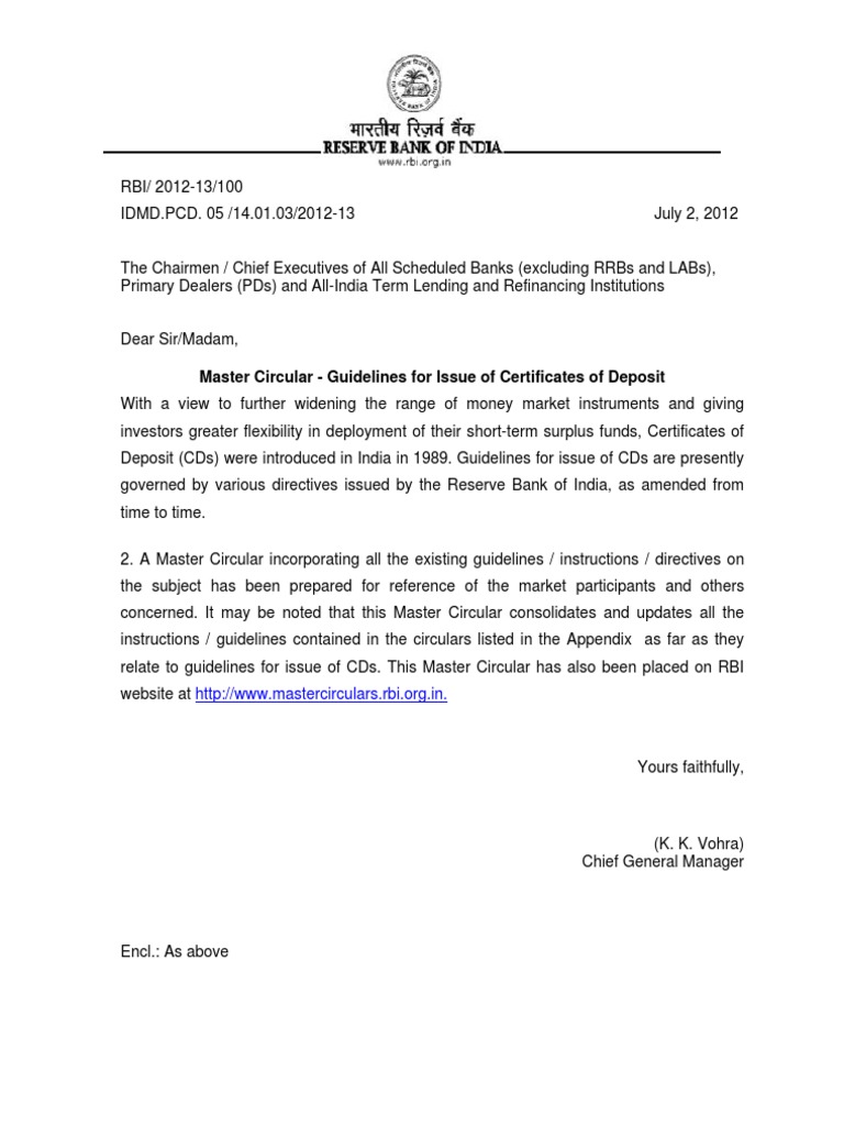 Certificates of Deposit Issued in India Guideline by RBI Certificate