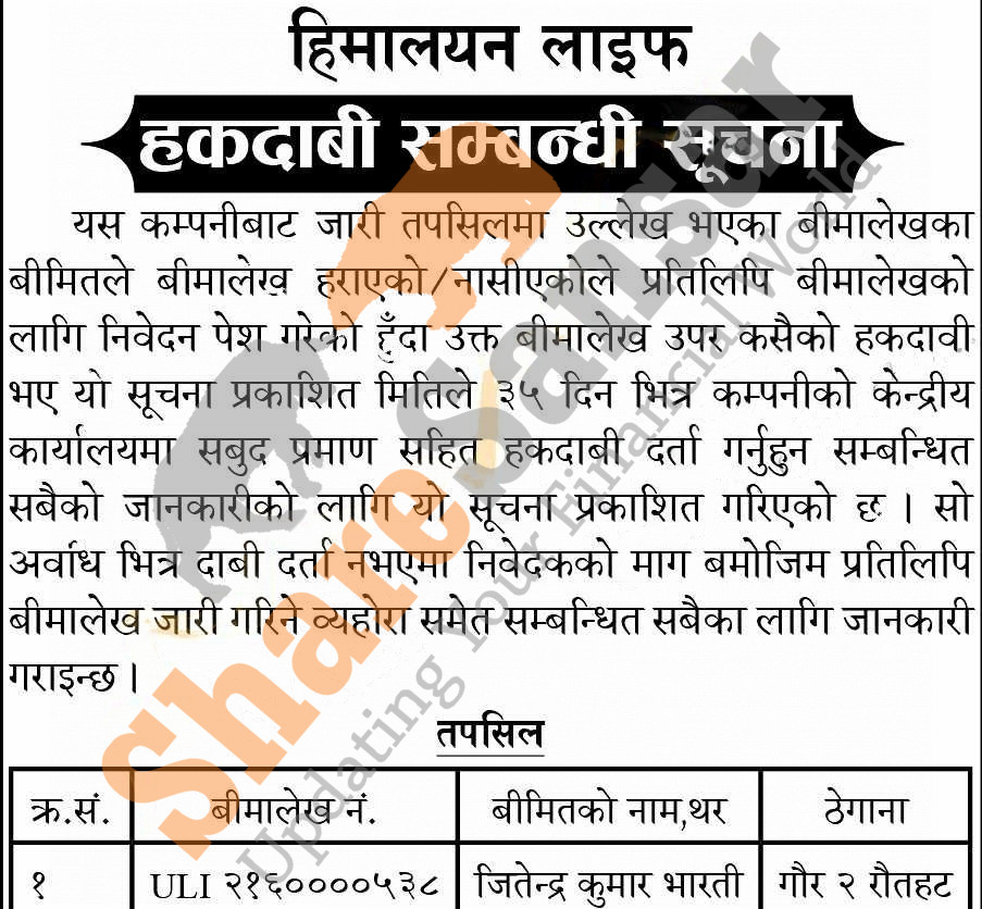 Prabhu Mahalaxmi Life Insurance Company Limited has published a notice
