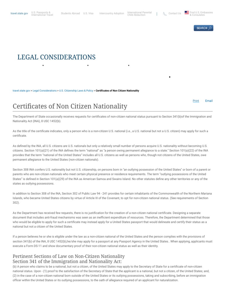 CERTIFICATE OF NON CITIZEN NATIONALITY: Requests from the Department of