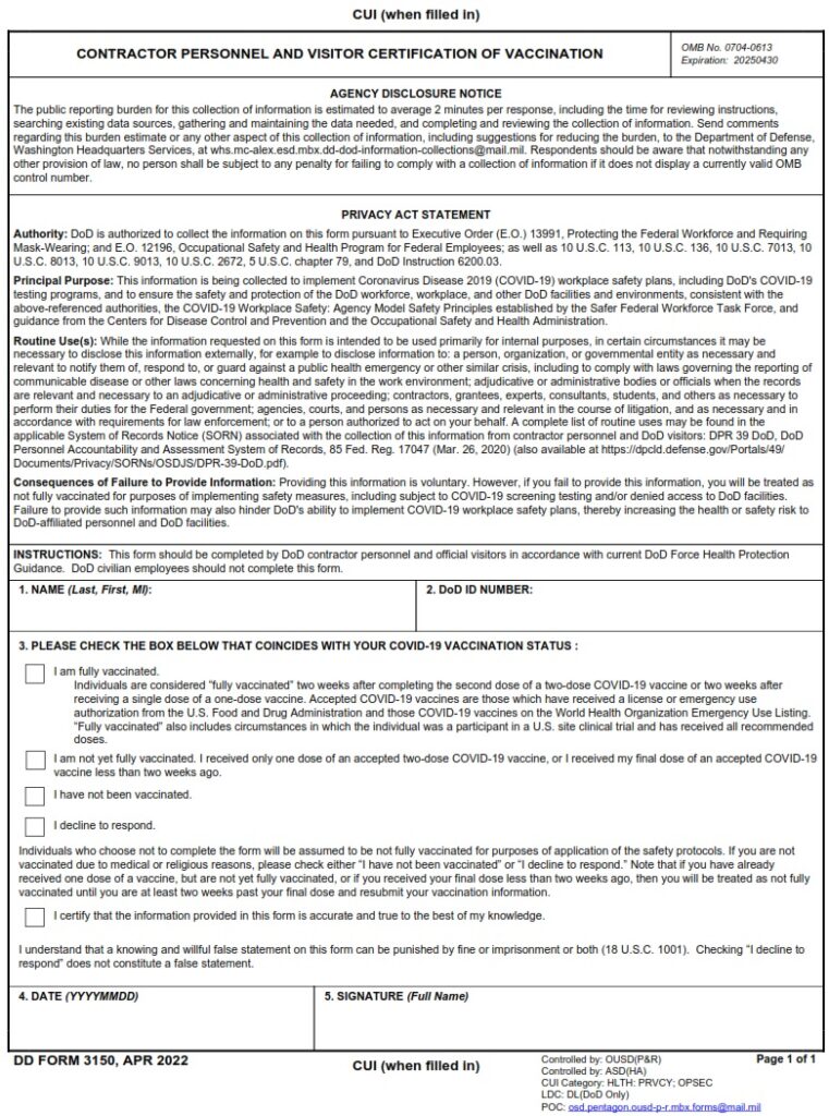 DD Form 3175 quot CIVILIAN EMPLOYEE CERTIFICATION of VACCINATION quot Fill