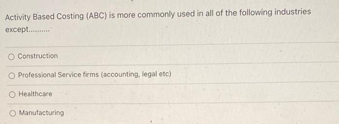 Solved Activity Based Costing (ABC) is more commonly used in Chegg com