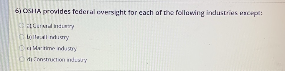 Solved: OSHA provides federal oversight for each of the following