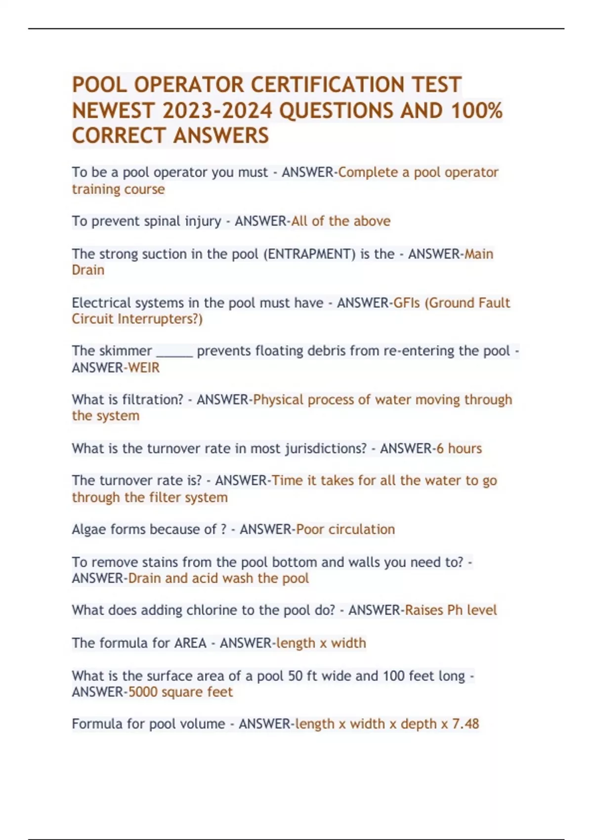 POOL OPERATOR CERTIFICATION TEST NEWEST QUESTIONS AND 100% CORRECT
