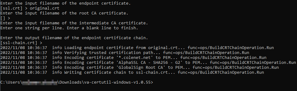How to create a full chain certificate from Windows certificate store