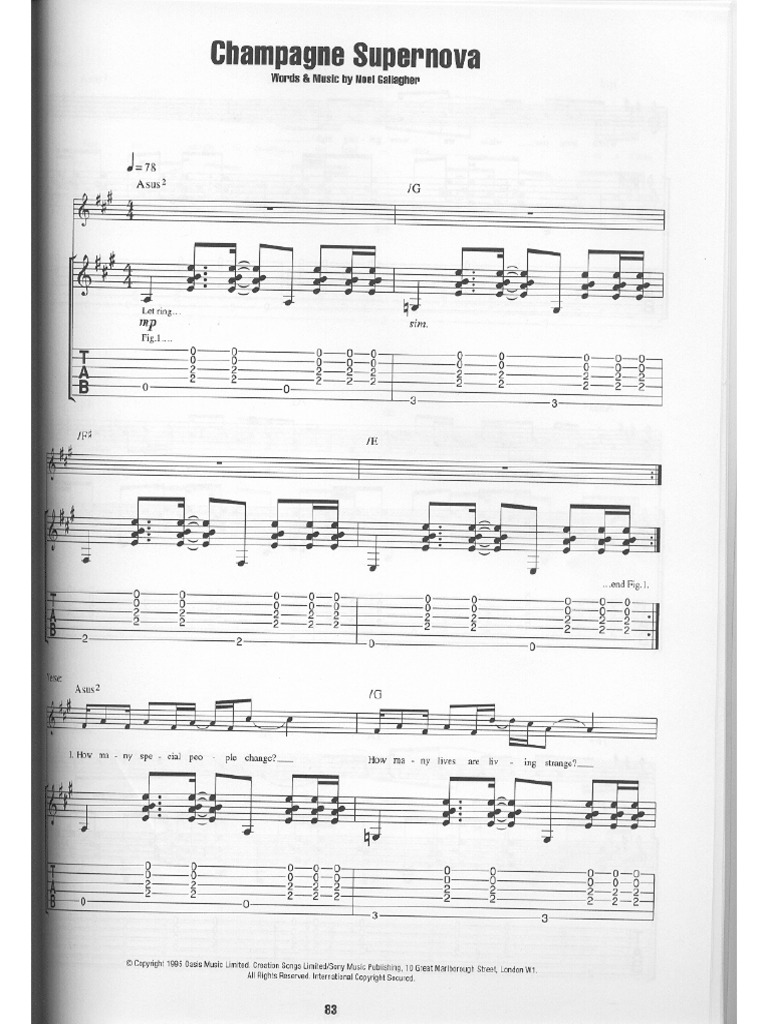 Oasis Champagne Supernova Band Score Sheet Music for Vocals Guitar