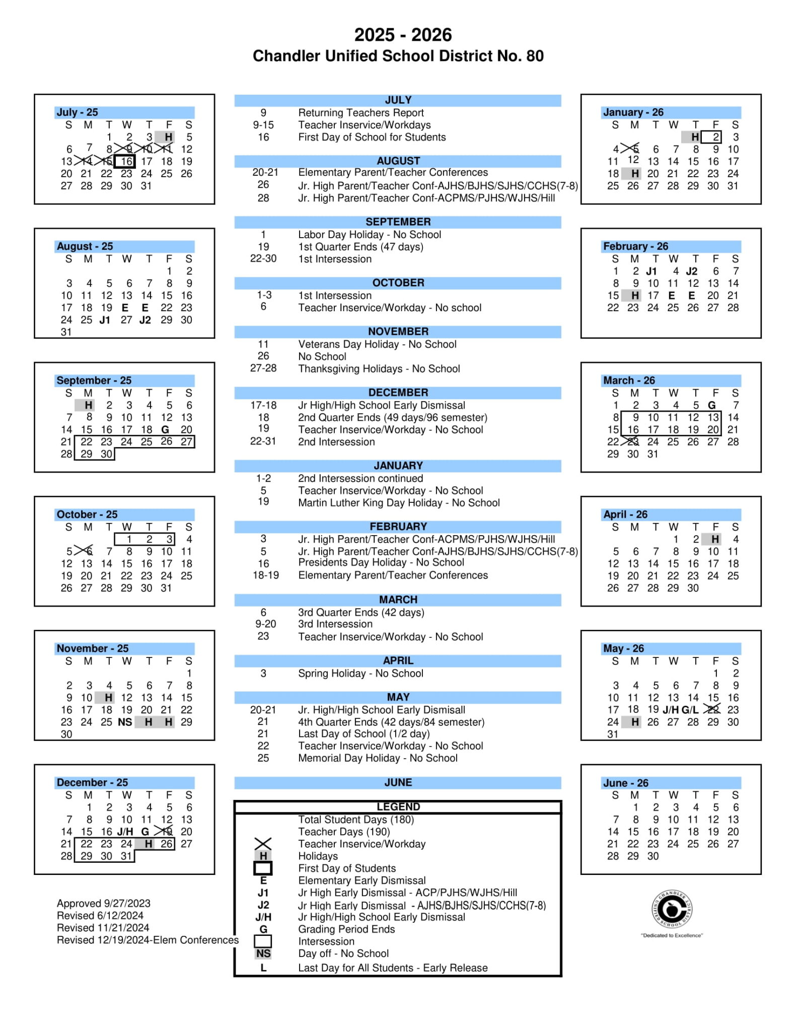 Chandler Unified School District AZ Calendar 25 26 Revised PDF
