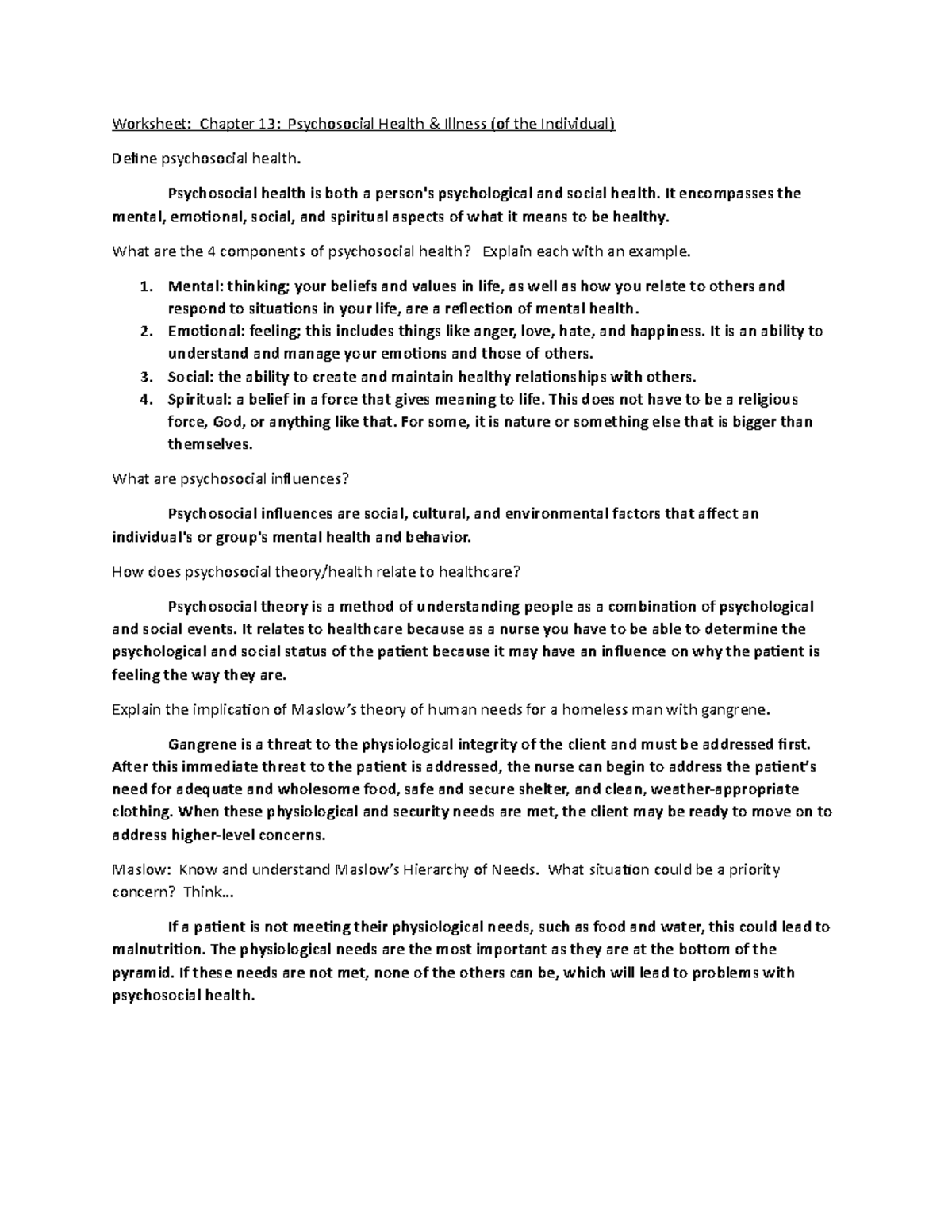 Worksheet Chapter 13 Worksheet: Chapter 13: Psychosocial Health