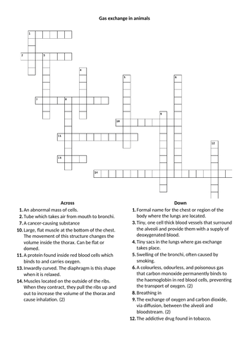 Crossword and keyword definitions list: Gas exchange Teaching Resources