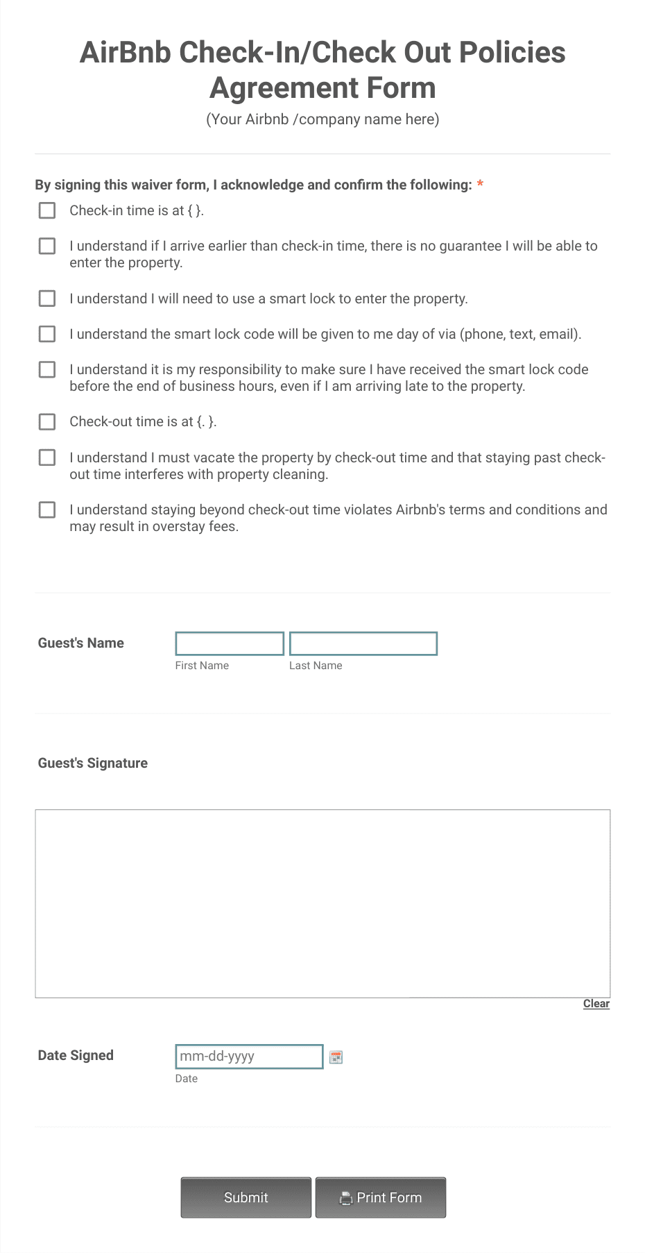 Airbnb Check InCheck Out Policies Agreement Form Template Jotform
