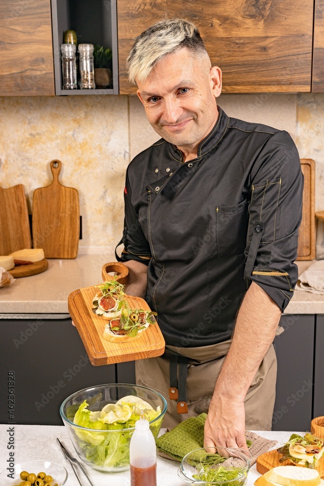 Charming chef is holding Italian bruschetta with cheese and figs A