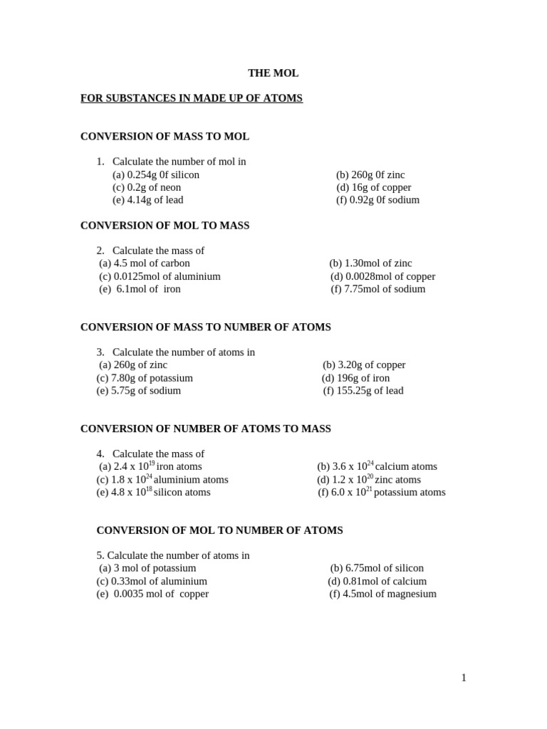 CHEM1001 Mol Worksheet PDF Mole (Unit) Chloride