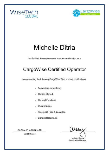 Cargowise certified specialist certificate Michelle Ditria PDF
