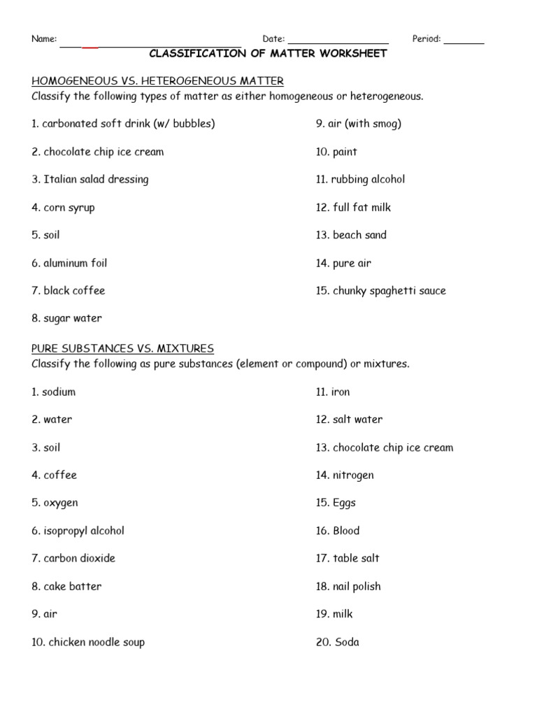 Chemistry 1 Worksheet Classification Of Matter Answer Key