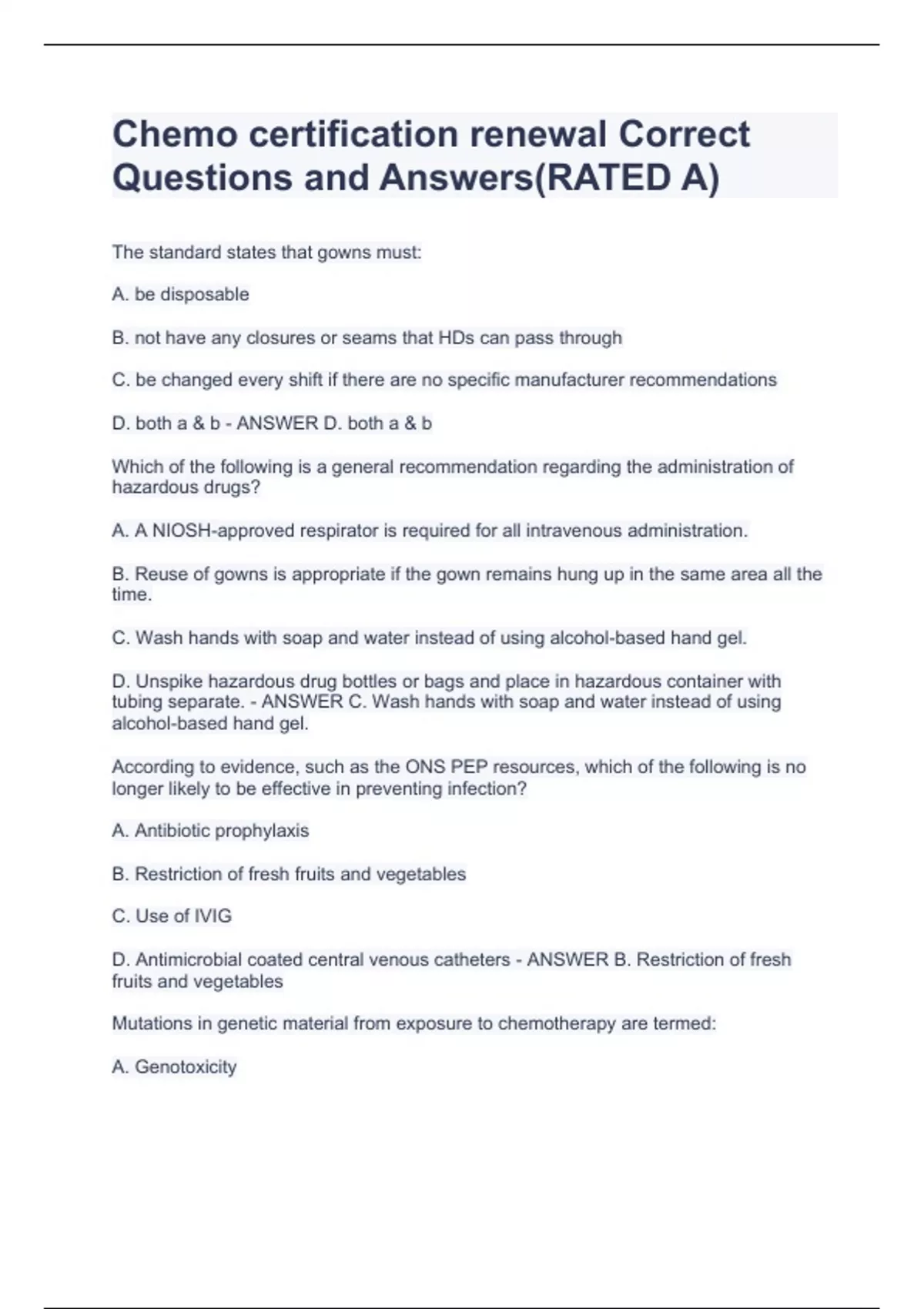 Chemo certification renewal Correct Questions and Answers(RATED A