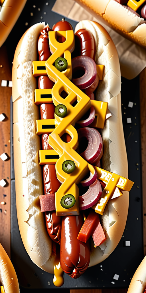 Colorful Hot Dog Creation with Unique Toppings and Playful Lettering Design