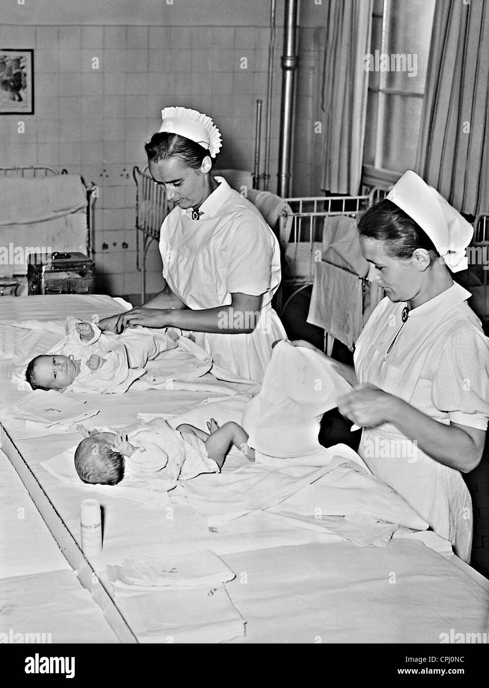 Mother and baby ward with nurses in attendance hospital in the 1920s