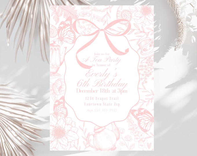 Digital Childrens Tea Party Invitation Garden Party Birthday Bow