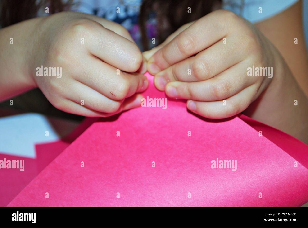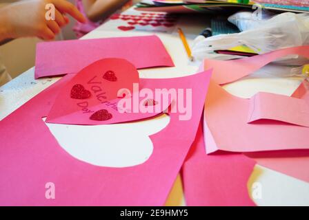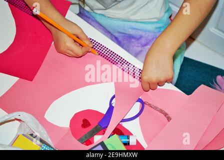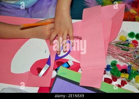Childs hands while making homemade valentines day cards arts and crafts