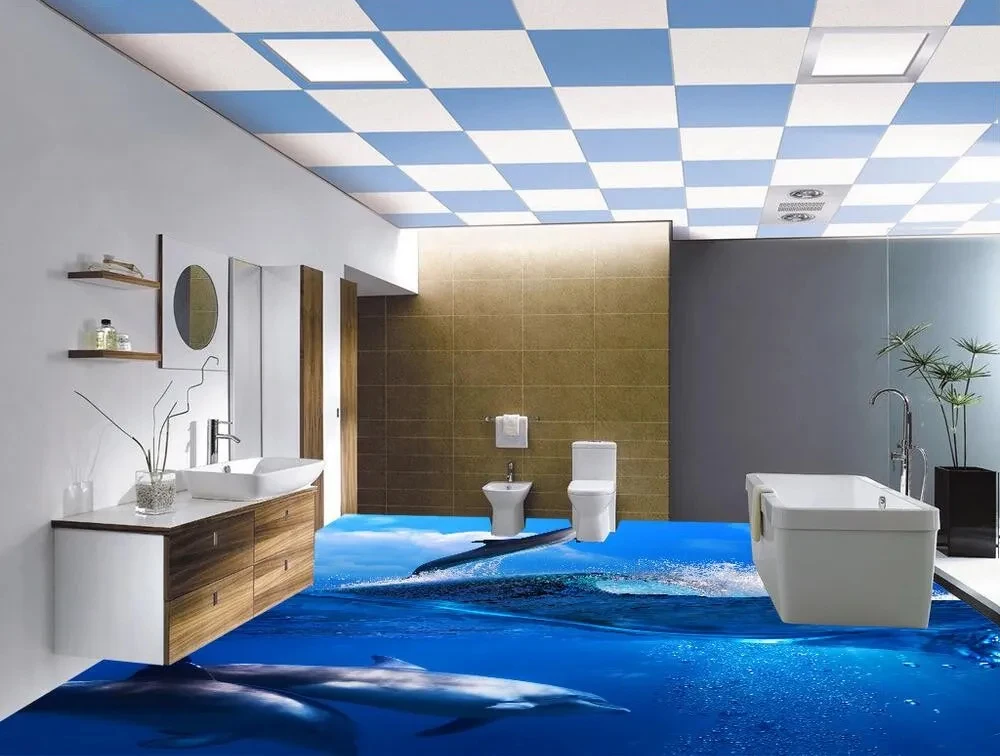 3D Blue Ocean Wave Dolphin Floor Mural Photo Flooring Wallpaper Print