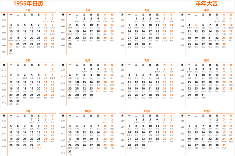 1955年日历表 日历表1955年日历全年 带农历 含周数 周一开始 在线网页版 日历精灵
