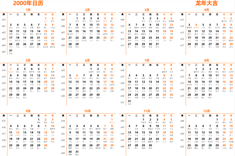 日历表2000日历 2000年日历全年完整图高清可打印免费下载 带节假日放假安排 日历精灵