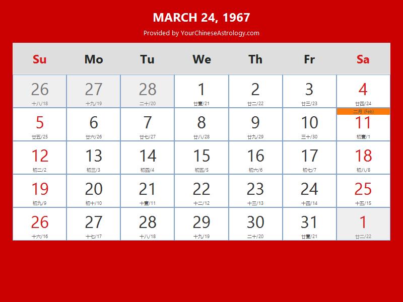 Chinese Calendar Mar 24 1967: Auspicious Things to Do and Hours Bazi