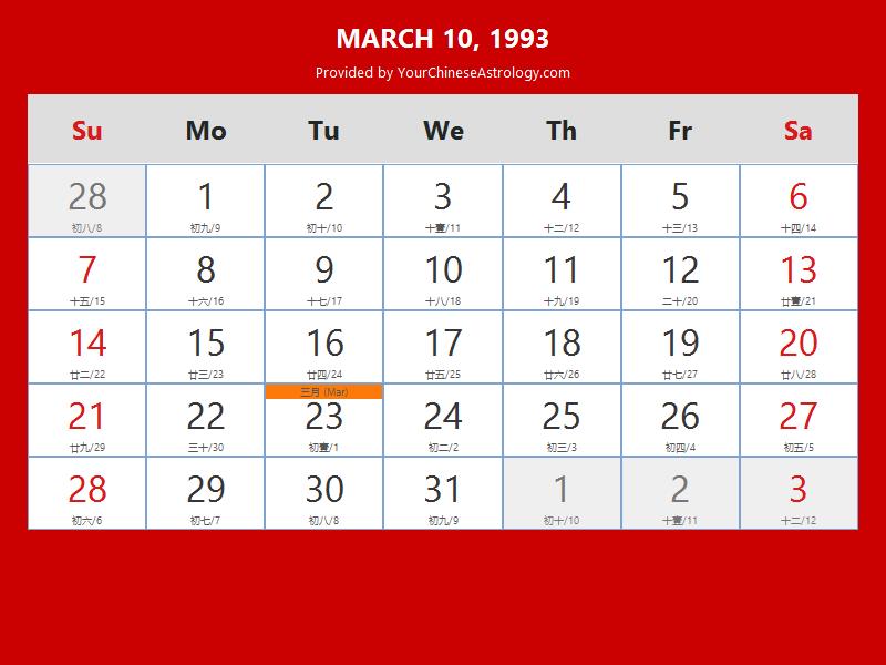 Chinese Calendar Mar 10 1993: Auspicious Things to Do and Hours Bazi
