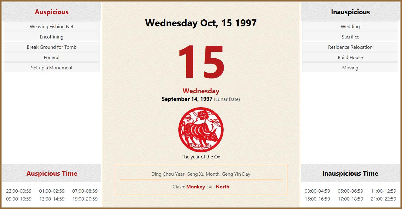 October 15 1997 Almanac Calendar: Auspicious/Inauspicious Events and