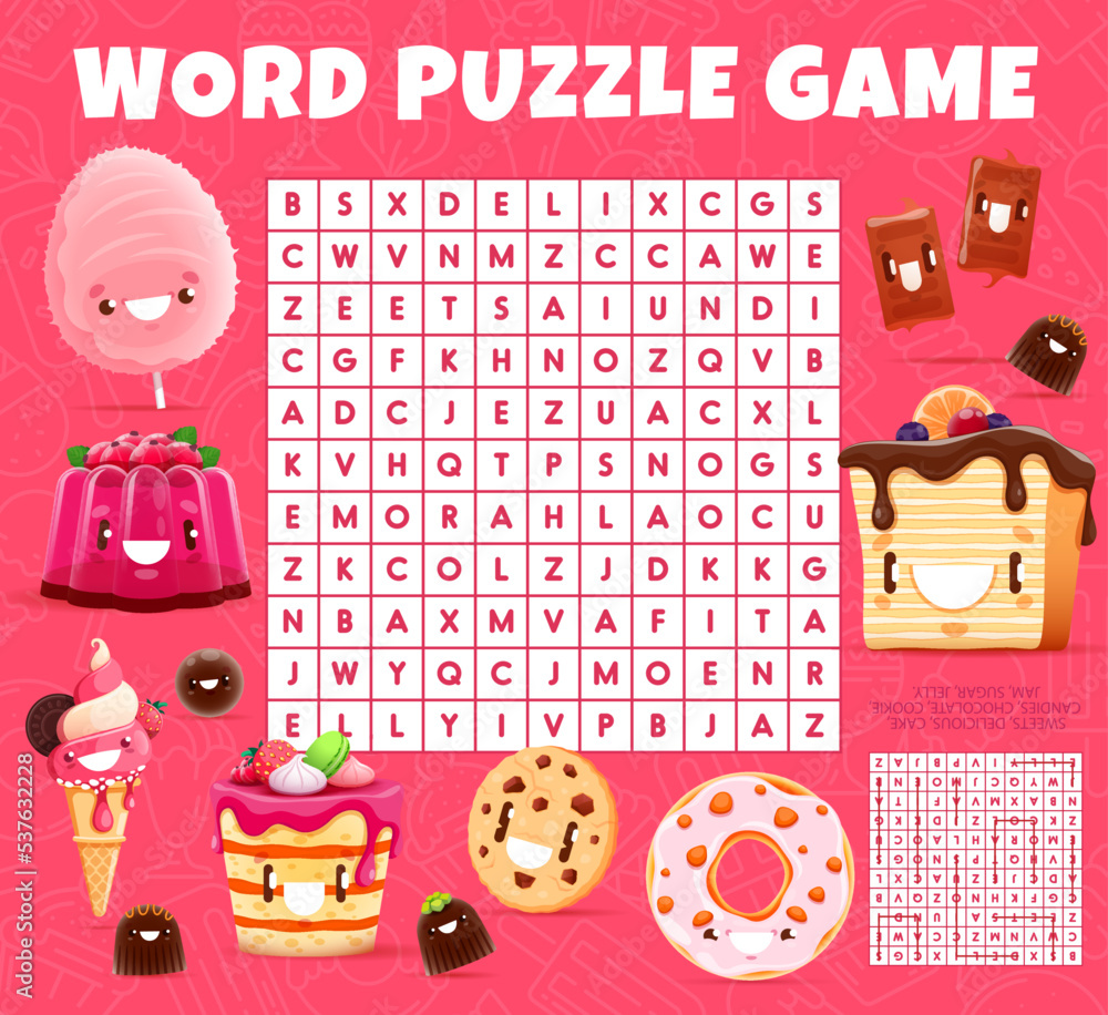 Crossword quiz game grid cartoon chocolate candies Child vocabulary