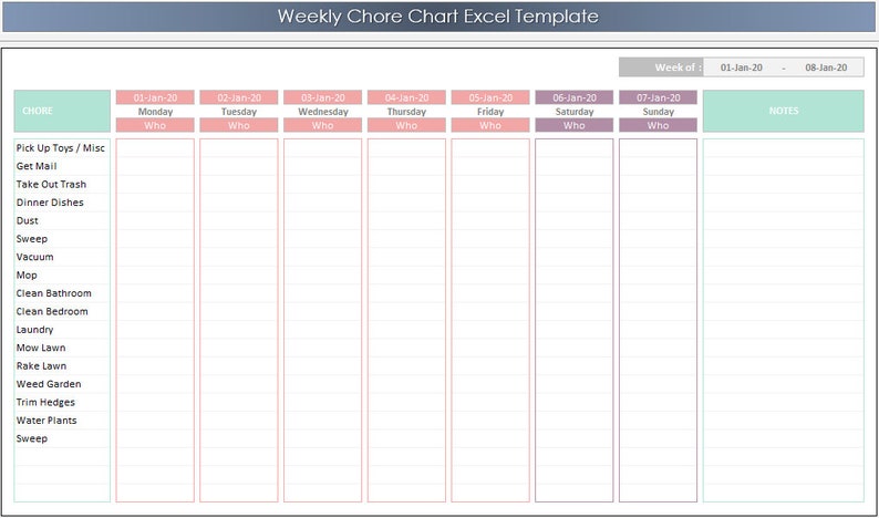 Weekly Chore Chart Excel Template Chore Planner Excel Etsy