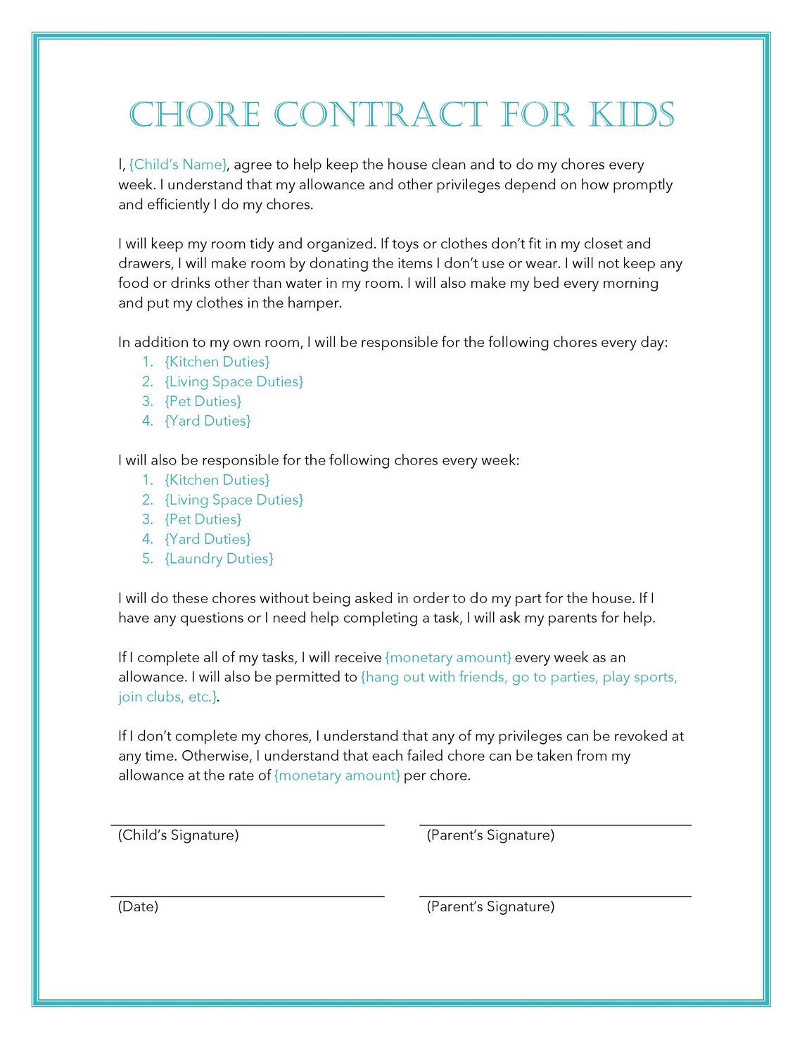 Chore Contract Template for Kids Detailed Household Chores Agreement