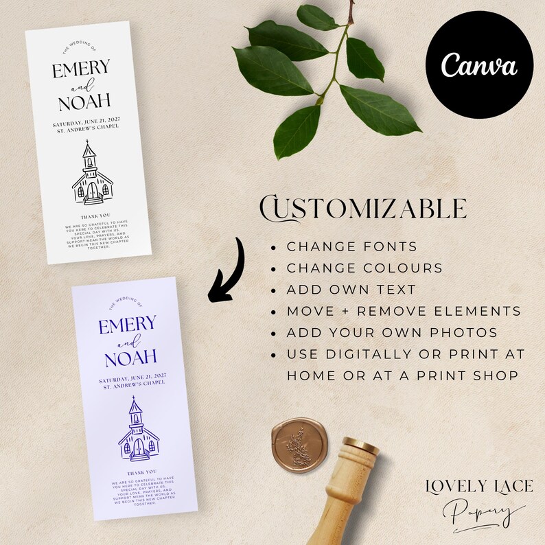 Christian Wedding Program Template: Hand drawn Church (canva Template