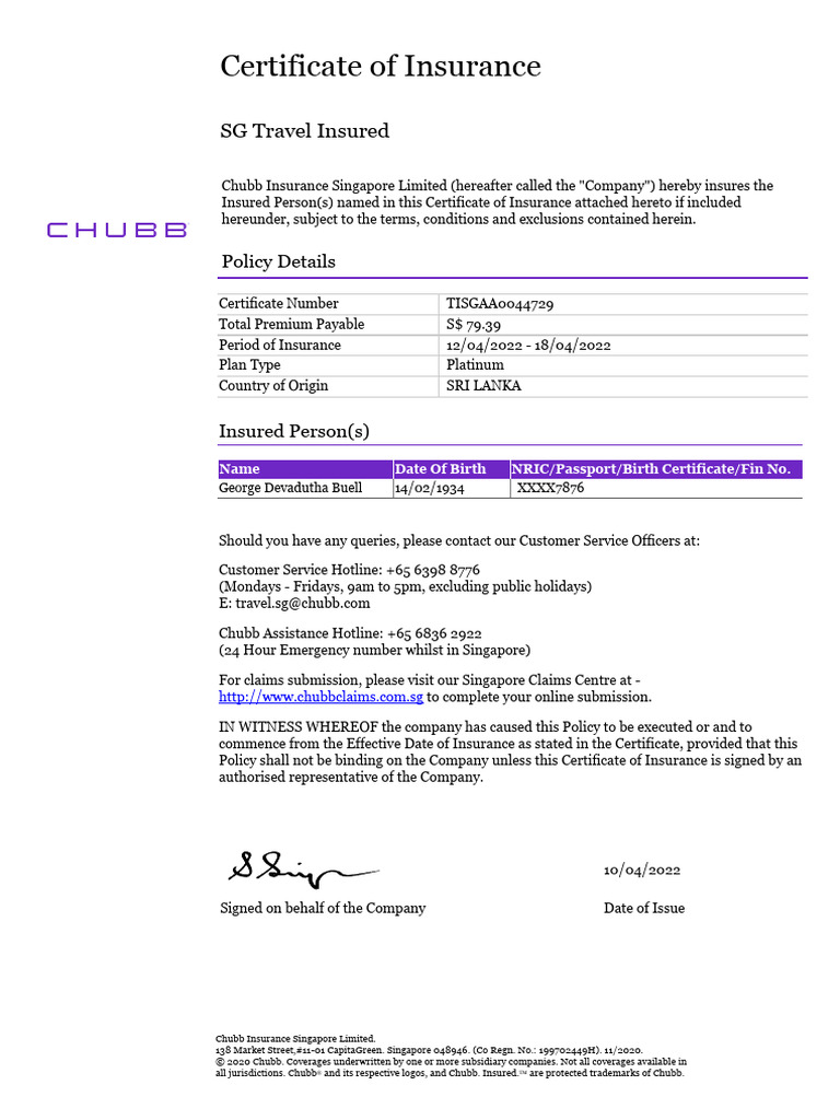 Certificate of insurance jul 2018 jun 2019 Chubb Insurance Singapore