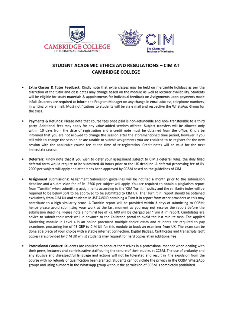 CIM Academic Ethics and Regulation CCBM PDF Turnitin Fee