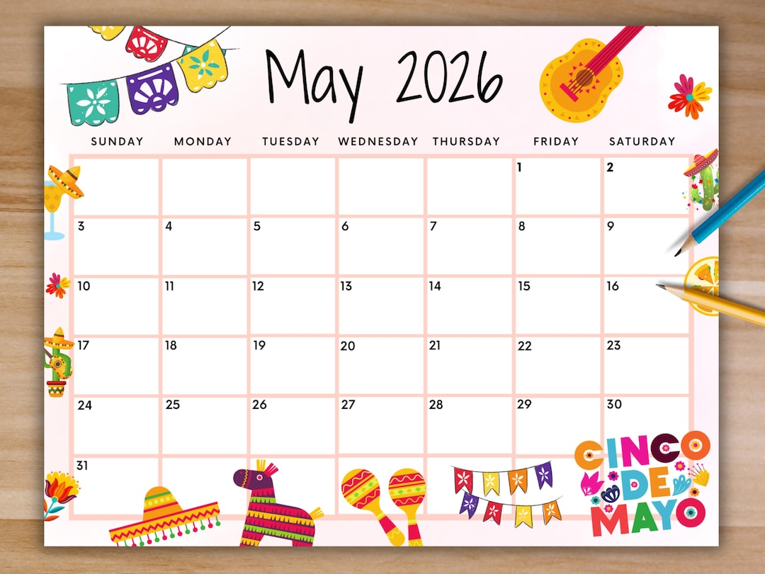 EDITABLE May 2026 Calendar Printable Cute Pink Cinco De Mayo Calendar