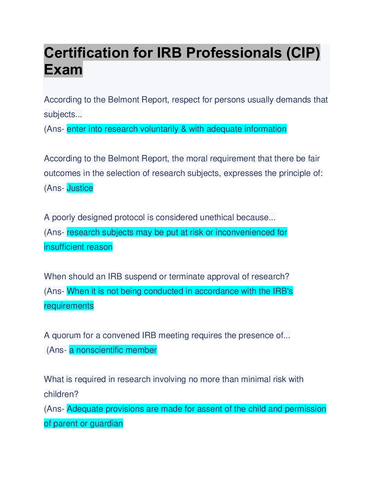 SOLUTION: Certification for irb professionals cip exam Studypool