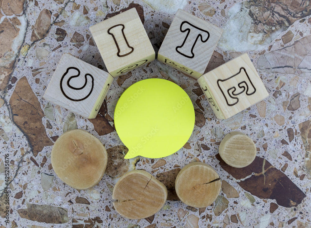 Cite concept with alphabet letters and cross section wooden circles