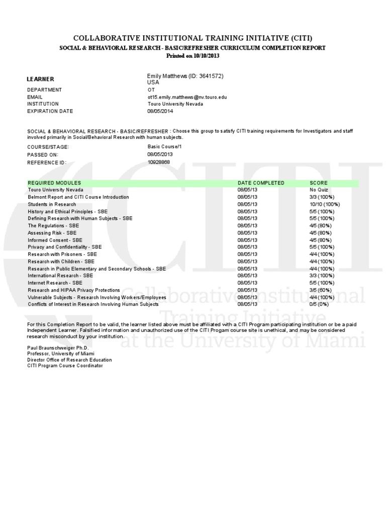 CITI Training RM: Citi Modules CITI Modules 9 17 CITI Certification