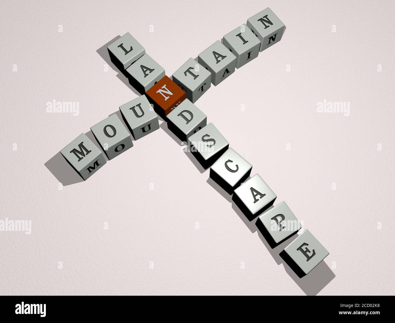 MOUNTAIN LANDSCAPE crossword by cubic dice letters 3D illustration
