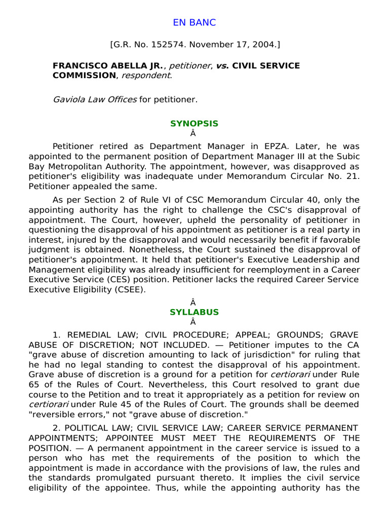 Abella Jr v Civil Service Commission PDF Standing (Law) Certiorari