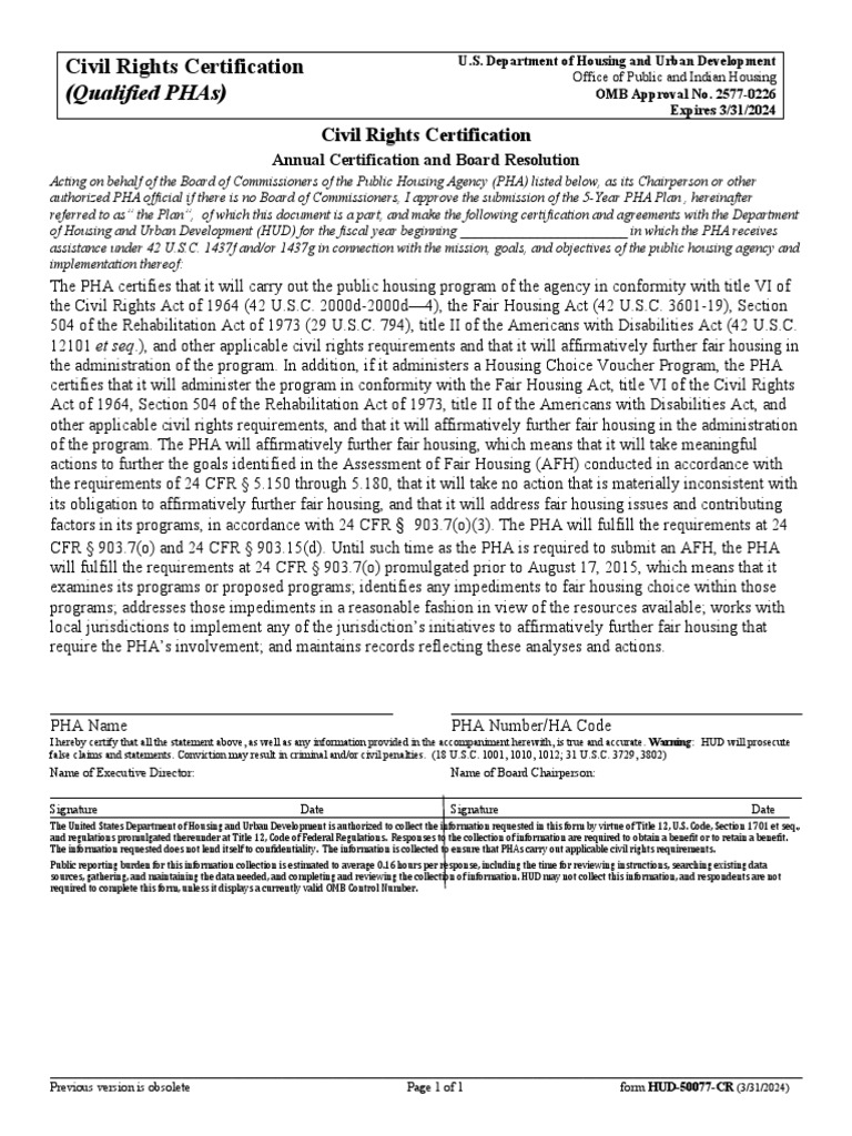 Fillable Online Civil Rights Certification (Qualified PHAs) Fax Email