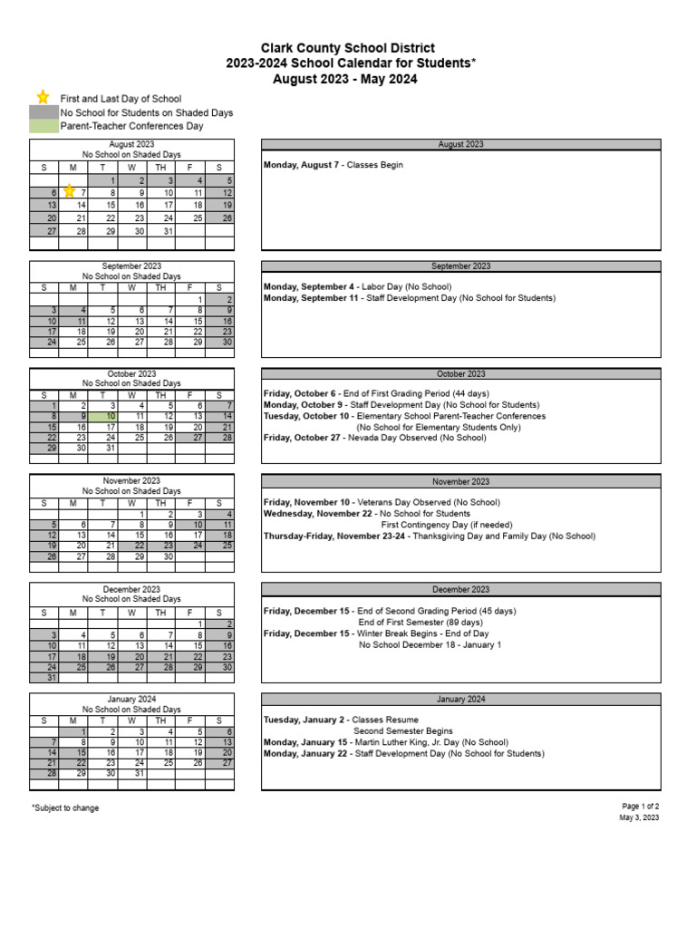 2023 2024 School Calendar Students Las Vegas Clark County Download