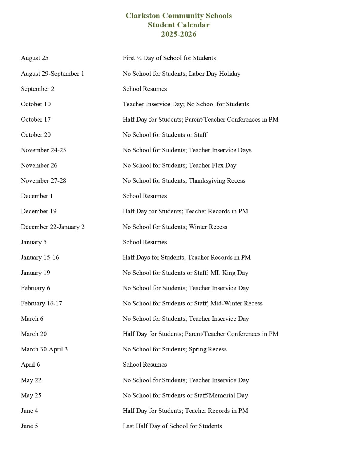 Clarkston Community Schools MI Calendar 25 26 Revised pdf EduCounty