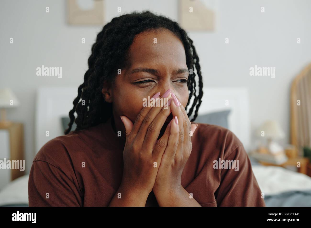 Woman sitting on bed in a softly lit room while covering her mouth and
